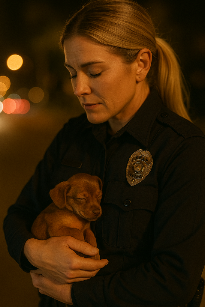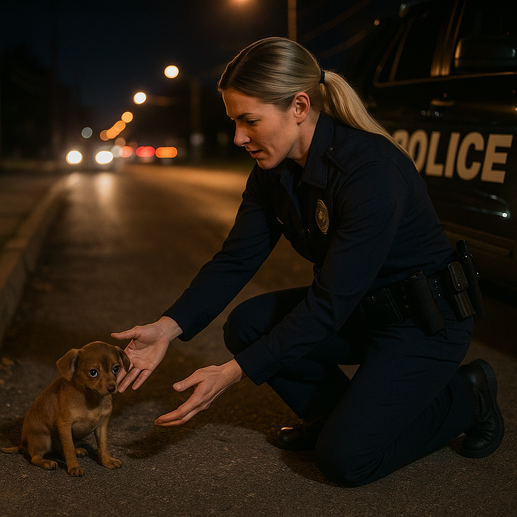 A patrol car slowly approached the intersection. Officer Emily, who was finishing her shift, noticed something unusual — a tiny figure beside the curb, barely visible in the dim light. She slowed down, squinting through her windshield. When she realized it was a puppy, her heart dropped. She immediately pulled over, stepped out, and walked toward the trembling little creature.